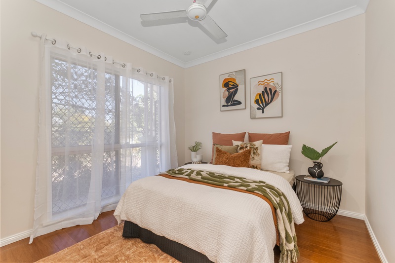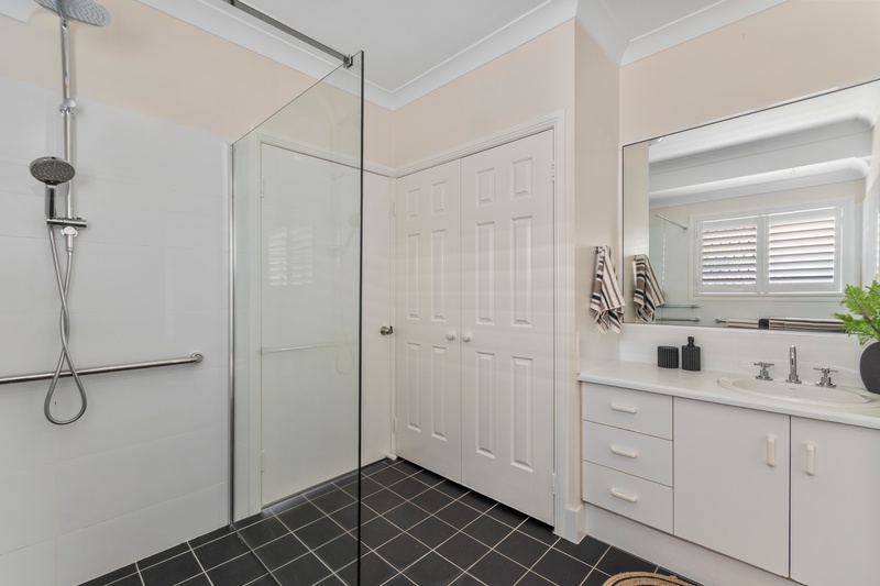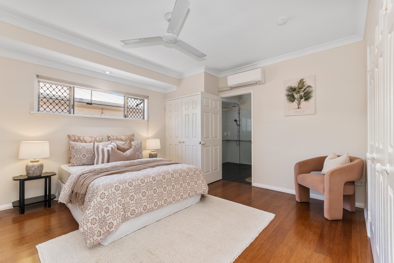 Three of the four bedrooms include built-in wardrobes, split-system air conditioning, and ceiling fans. The master bedroom has a two-way connection to the bathroom, providing privacy and convenience. The fourth bedroom, located at the front of the home, can serve as a guest room, home office, or study.