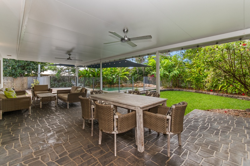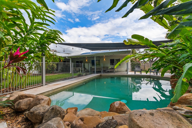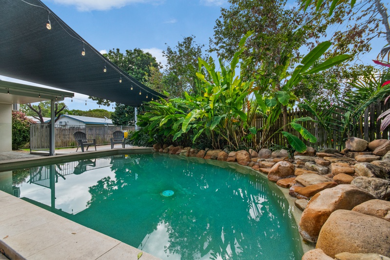 Just beyond, a sparkling in-ground pool invites you to cool off on warm North Queensland days. Framed by tropical landscaping and a rock feature, the pool area is both serene and secure, with fencing and shade sails providing safety and comfort.