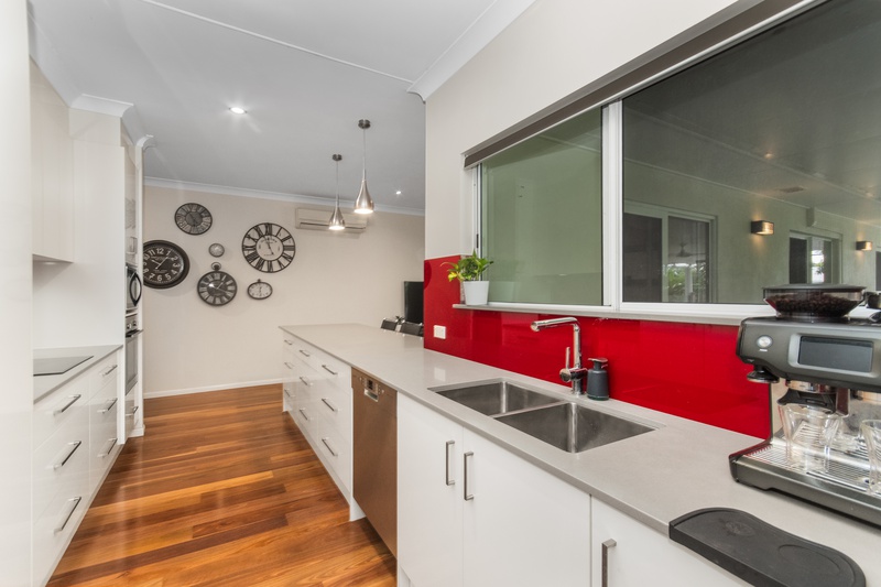 Just around the corner, the kitchen offers everything you need: generous bench space, an electric cooktop and oven, dishwasher, and a bold red splashback that adds personality and colour to the heart of the home.
