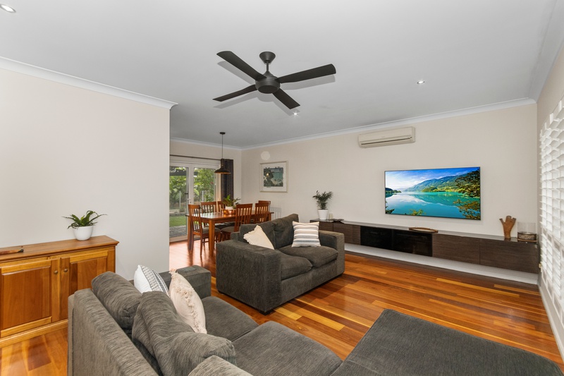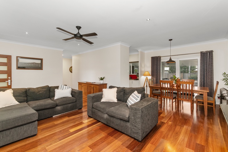 Step inside to discover a warm and welcoming layout, starting with the main living area, featuring stunning spotted gum engineered flooring, elegant PVC shutters, and a fixed floating entertainment cabinet. This flows seamlessly into the dining area, where double glass doors open to a huge undercover outdoor entertaining space – perfect for gatherings with family and friends.