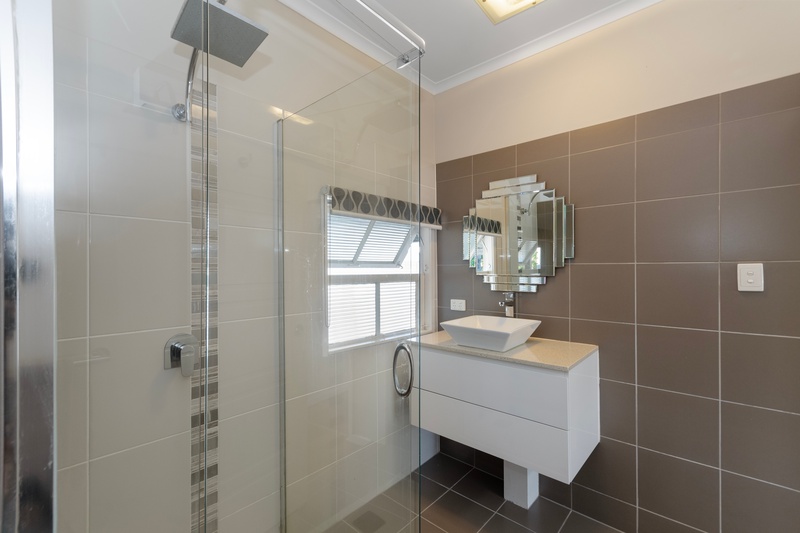 The main bathroom is both spacious and stylish, including a shower and vanity. The toilet is discreetly tucked around the corner, offering added privacy.