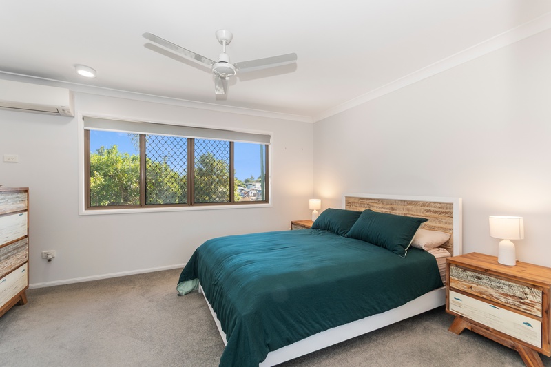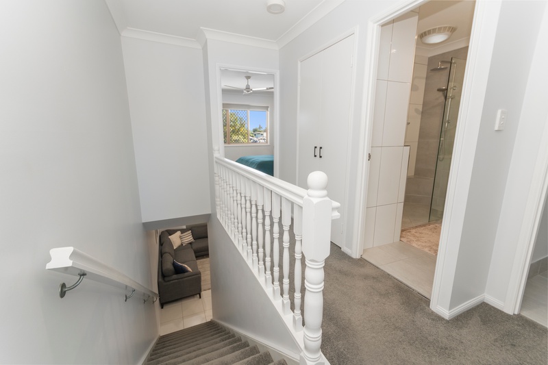 Upstairs, you’ll find plush carpet underfoot and two generously sized bedrooms — both with built-in wardrobes and split-system air conditioning for year-round comfort. The modern main bathroom is centrally located and accompanied by an additional toilet and extra linen storage.