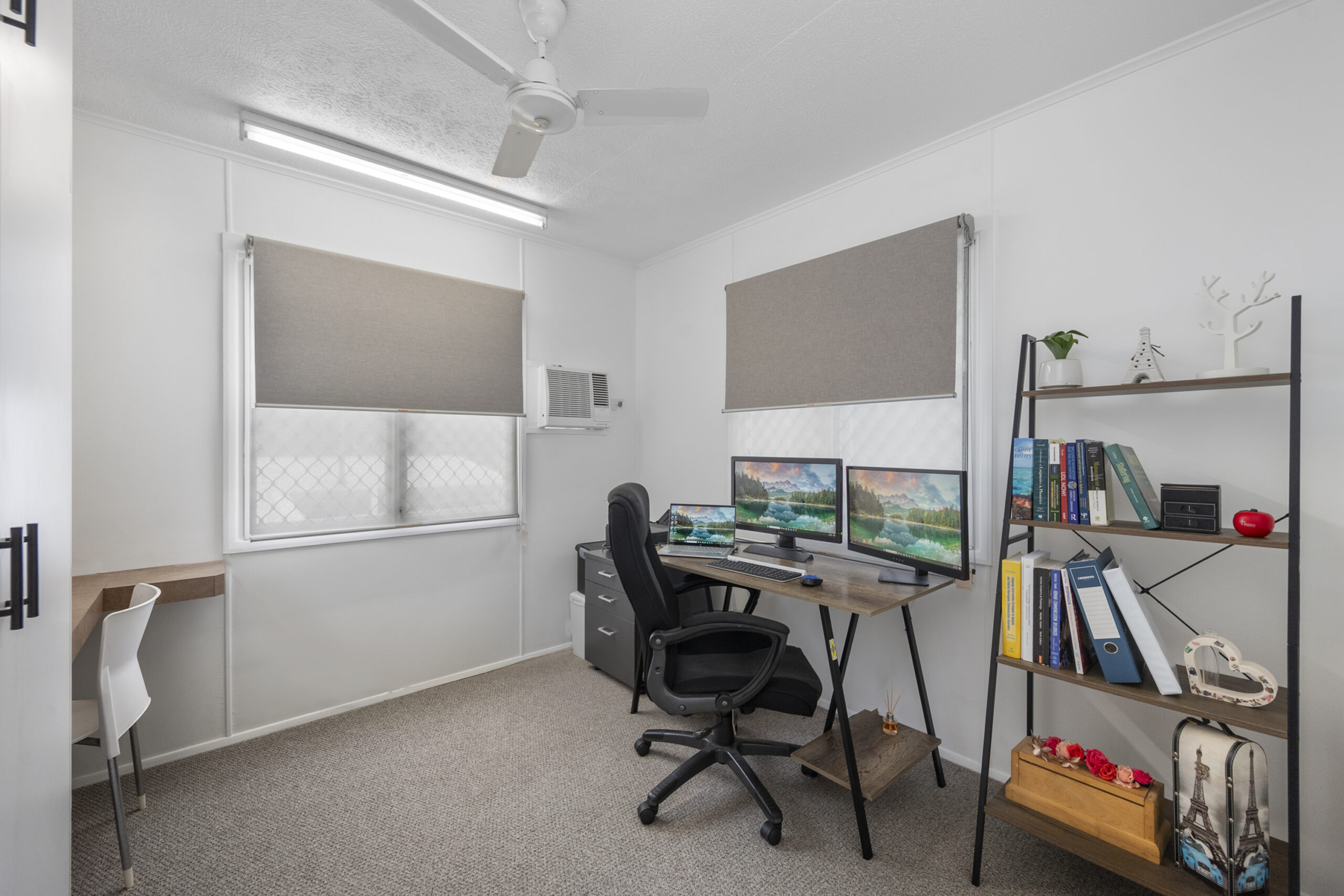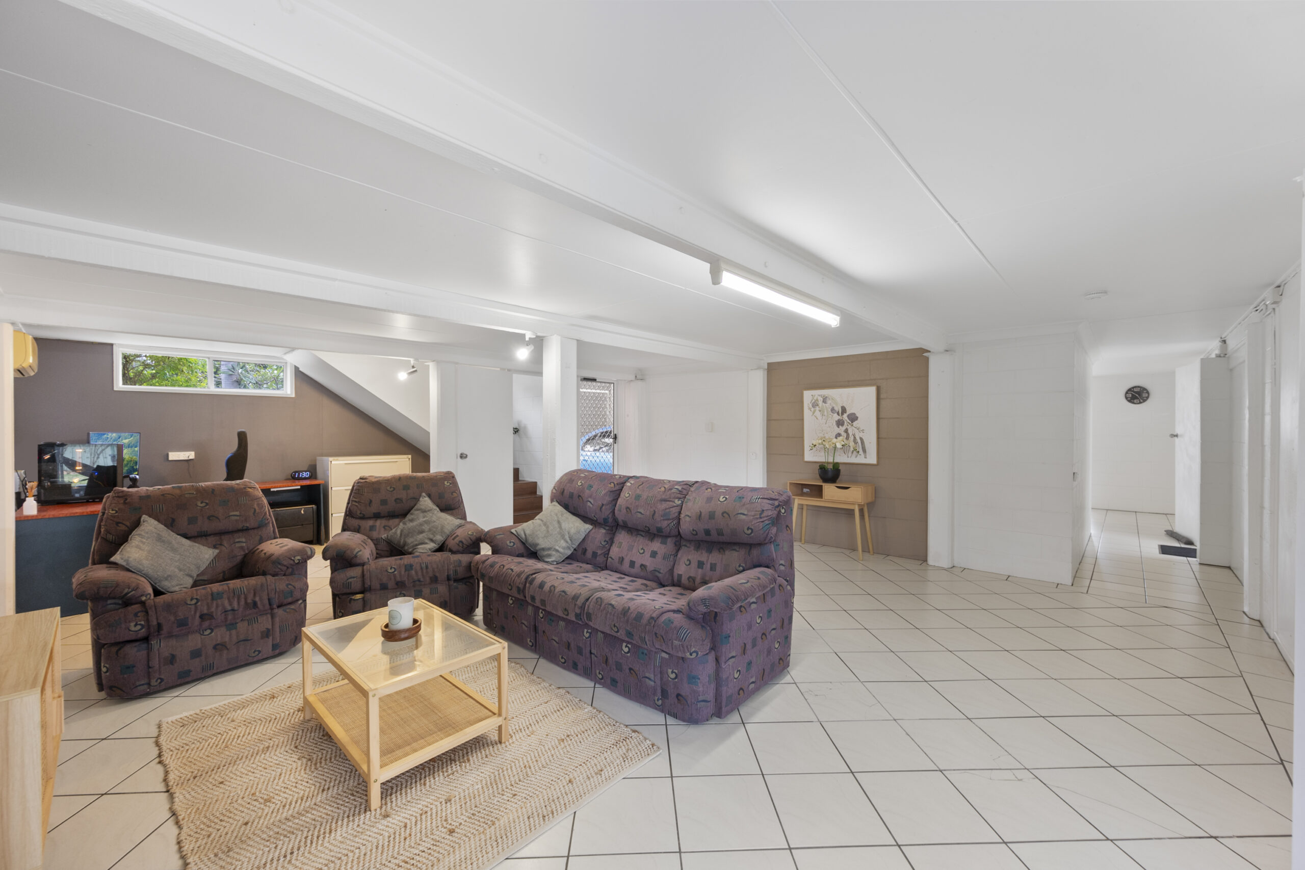 Down the hall, three bedrooms await, each with built-in cupboards, carpeted floors, and air conditioning. Bedroom three has a dedicated study desk in a quiet corner, ideal for work or study sessions. Adjacent to the bedrooms, a generously sized bathroom offers convenience and comfort.