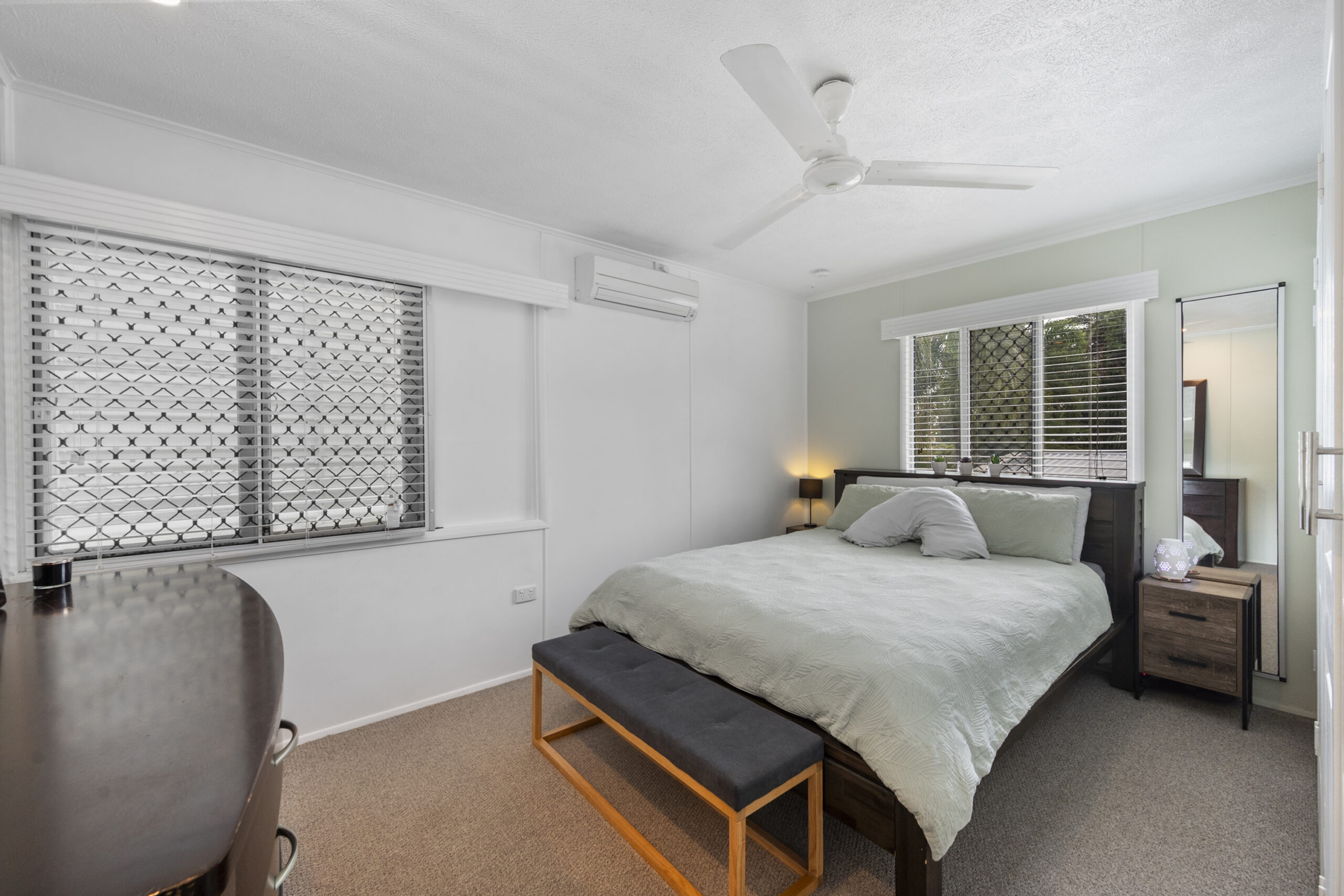 • Three bedrooms with built-in cupboards, carpet, and air conditioning