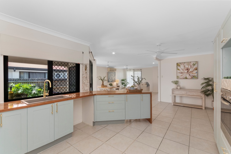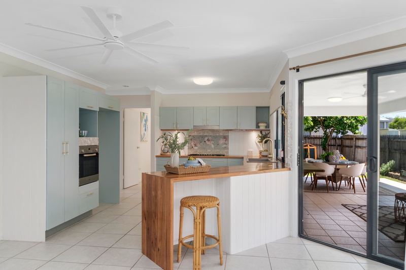 At the heart of the home, the blue kitchen with gold fittings and timber countertops provides ample storage and workspace. A glass stove and electric oven sit beneath a decorative stone and flower feature, perfect for those who love to cook and entertain. The open-plan living area, complete with a split-system air conditioner, flows effortlessly to the back patio, creating an inviting space for family gatherings or quiet afternoons.
